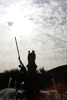 at the fountain are laughing together between